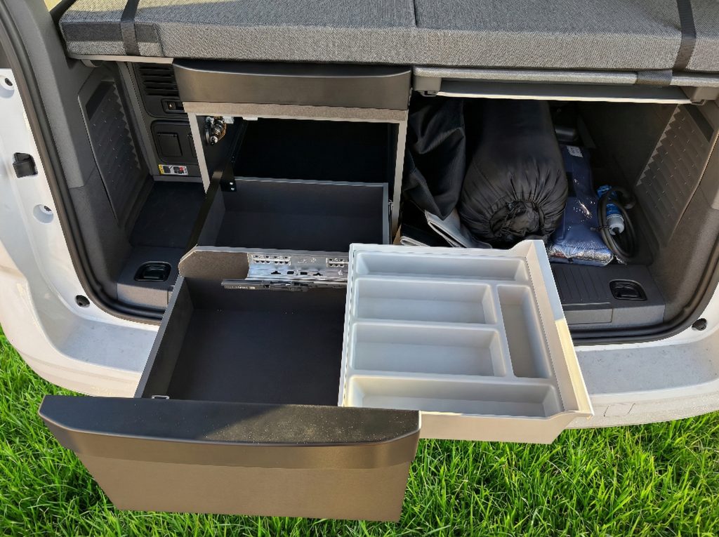 - Asientos: Dos asientos traseros independientes que ofrecen una gran flexibilidad de configuración. Se puede poner fácilmente un tercero que hemos quitado para poner la nevera. Pero hay que elegir, nevera o 5ª plaza sentado.