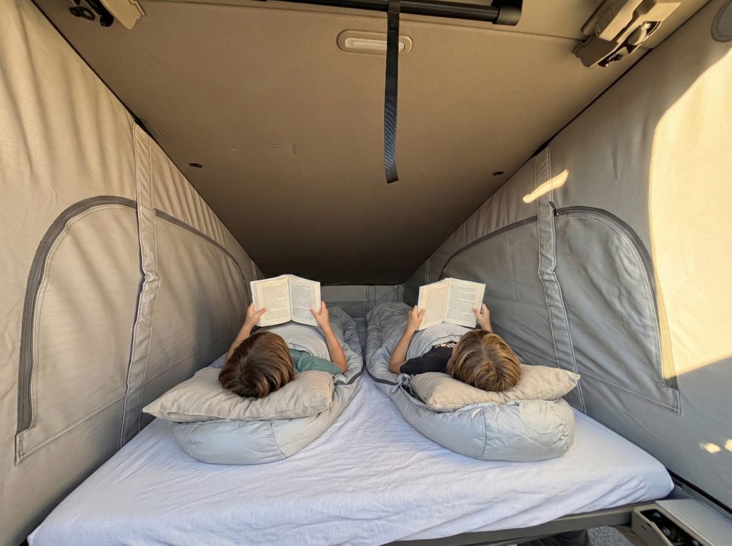 - Capacidad para dormir: Cama inferior de despliegue rápido para dos personas y cama en el techo elevable para otras dos.